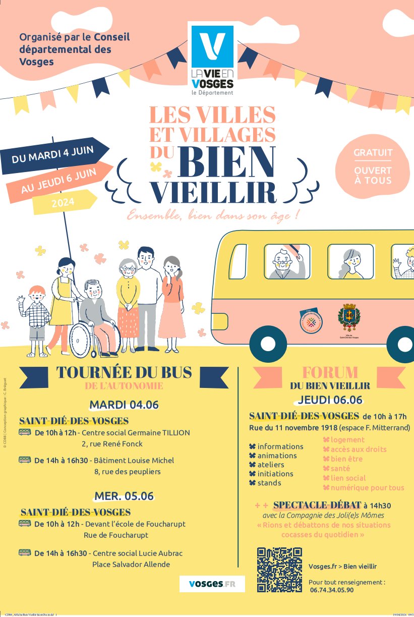 Dans son itinéraire 2024, le bus de l’autonomie fera une halte à Saint-Dié-des-Vosges jeudi 6 juin de 10 h à 17 h, à l’espace François-Mitterrand, pour le forum du bien vieillir ! Cette action vise à proposer des solutions simples d’aménagement du domicile et des aides techniques et financières pour faciliter le quotidien des personnes de plus de 60 ans.